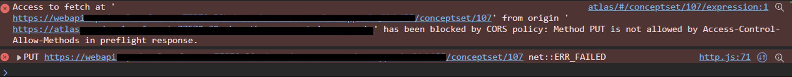 We updated the CORS settings on the WebAPI container app. After adding the needed HTTP methods, everything started working immediately. No code changes to ATLAS or WebAPI was needed, just a configuration change on the hosting side.