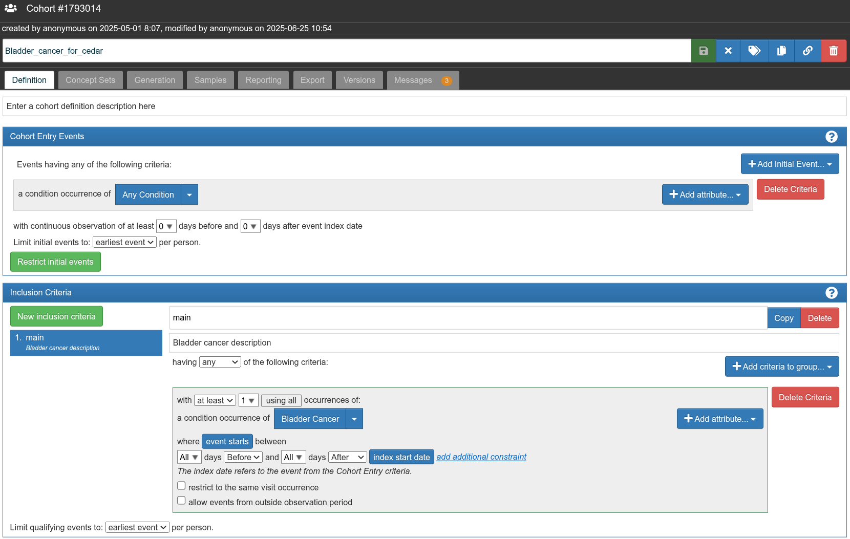 That said, I’m wondering why you have put “Any condition” as the cohort entry event? With this definition, patients are entering your cohort on their earliest condition_occurrence (of any condition) rather than their earliest bladder cancer diagnosis. That’s why you’re seeing lots of noise when you look at events on the cohort entry date for patients in this cohort.