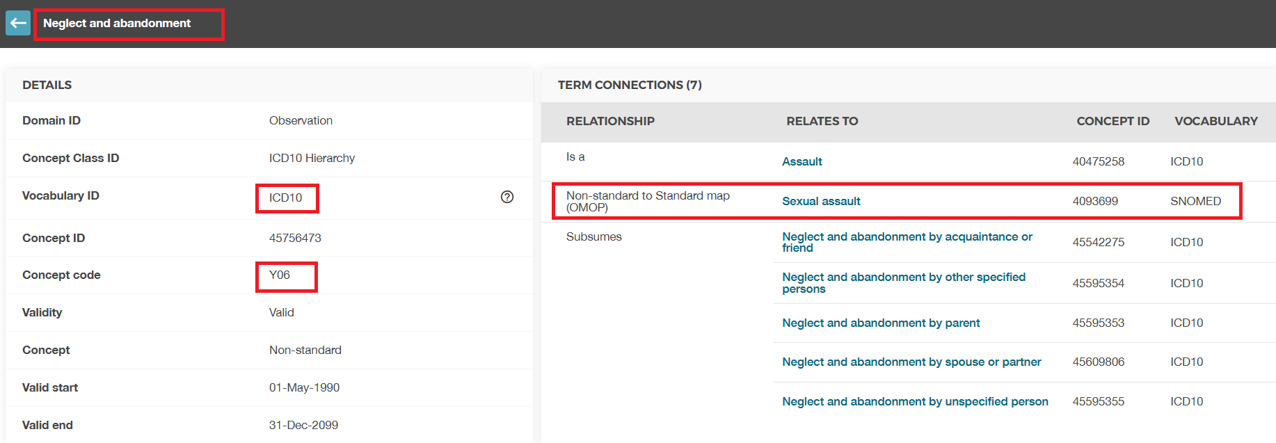 Hello. The Non-standard to Standard Map (OMOP) for ICD-10 code Y06 (Neglect and Abandonment) is shown in the figure.